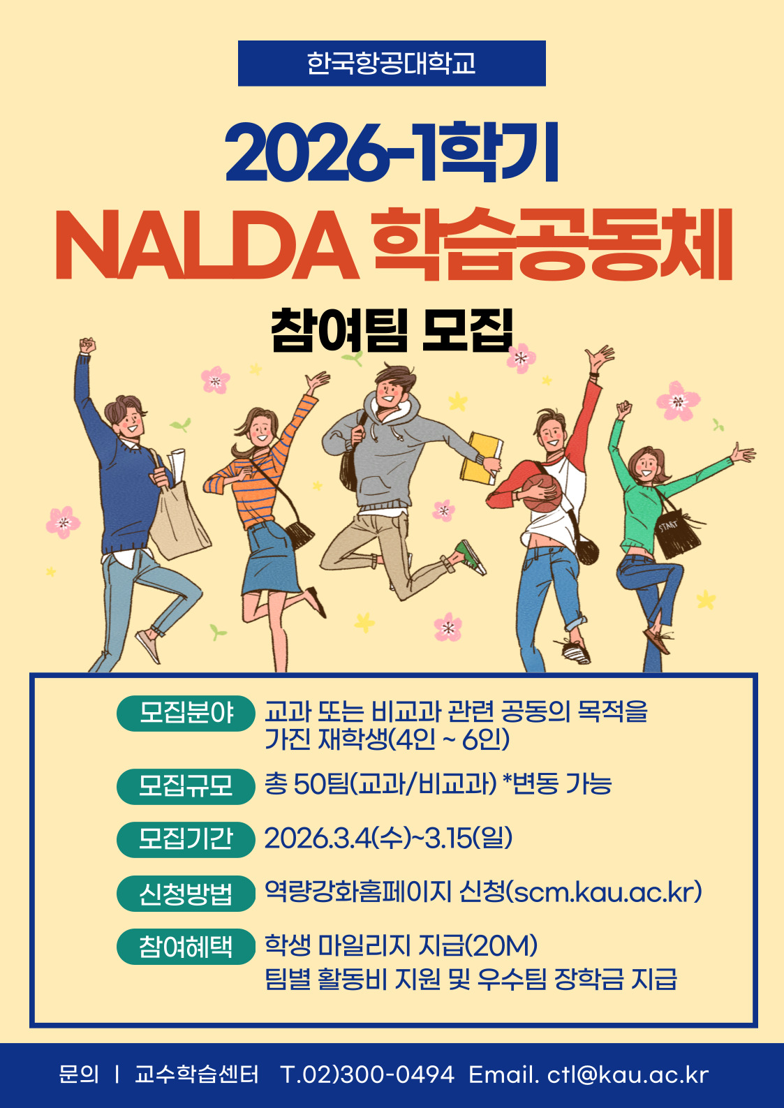 2026학년도 1학기 NALDA 학습공동체를 다음과 같이 모집 하오니 많은 학생들의 관심과 참여를 부탁드립니다.