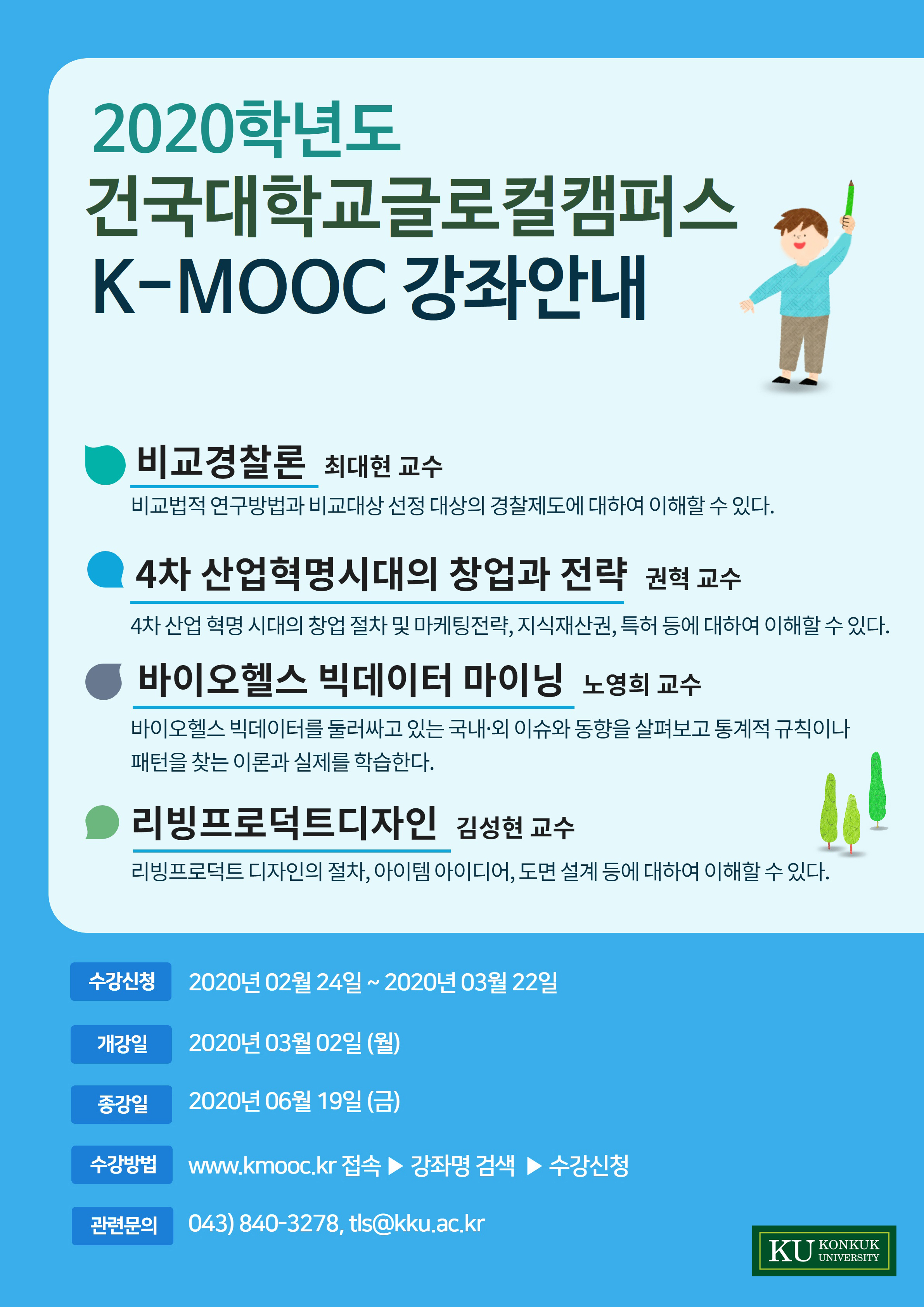건국대학교에서 한국형 온라인 공개강좌(K-MOOC)를 아래와 같이 운영합니다.