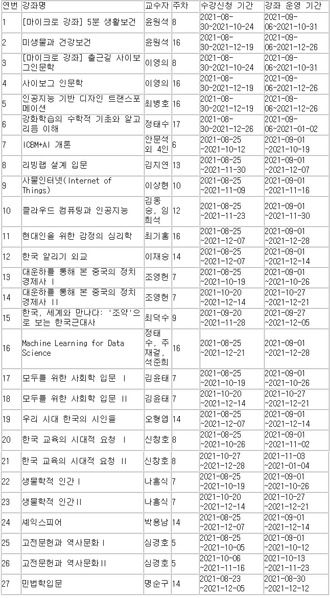 고려대학교에서 한국형 온라인 공개강좌(K-MOOC)를 아래와 같이 운영합니다.