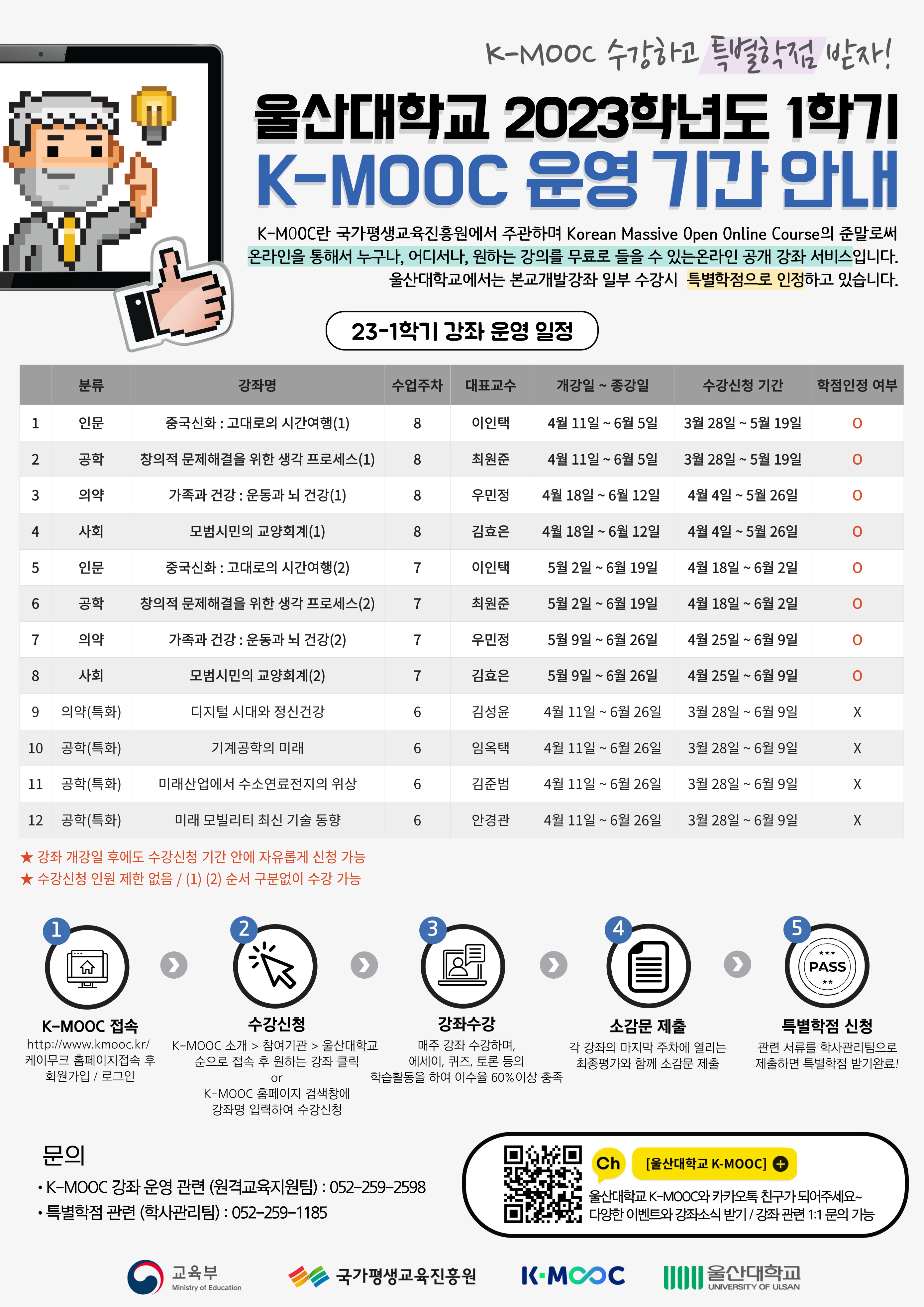 울산대학교에서 한국형 온라인 공개강좌(K-MOOC)를 아래와 같이 운영합니다.