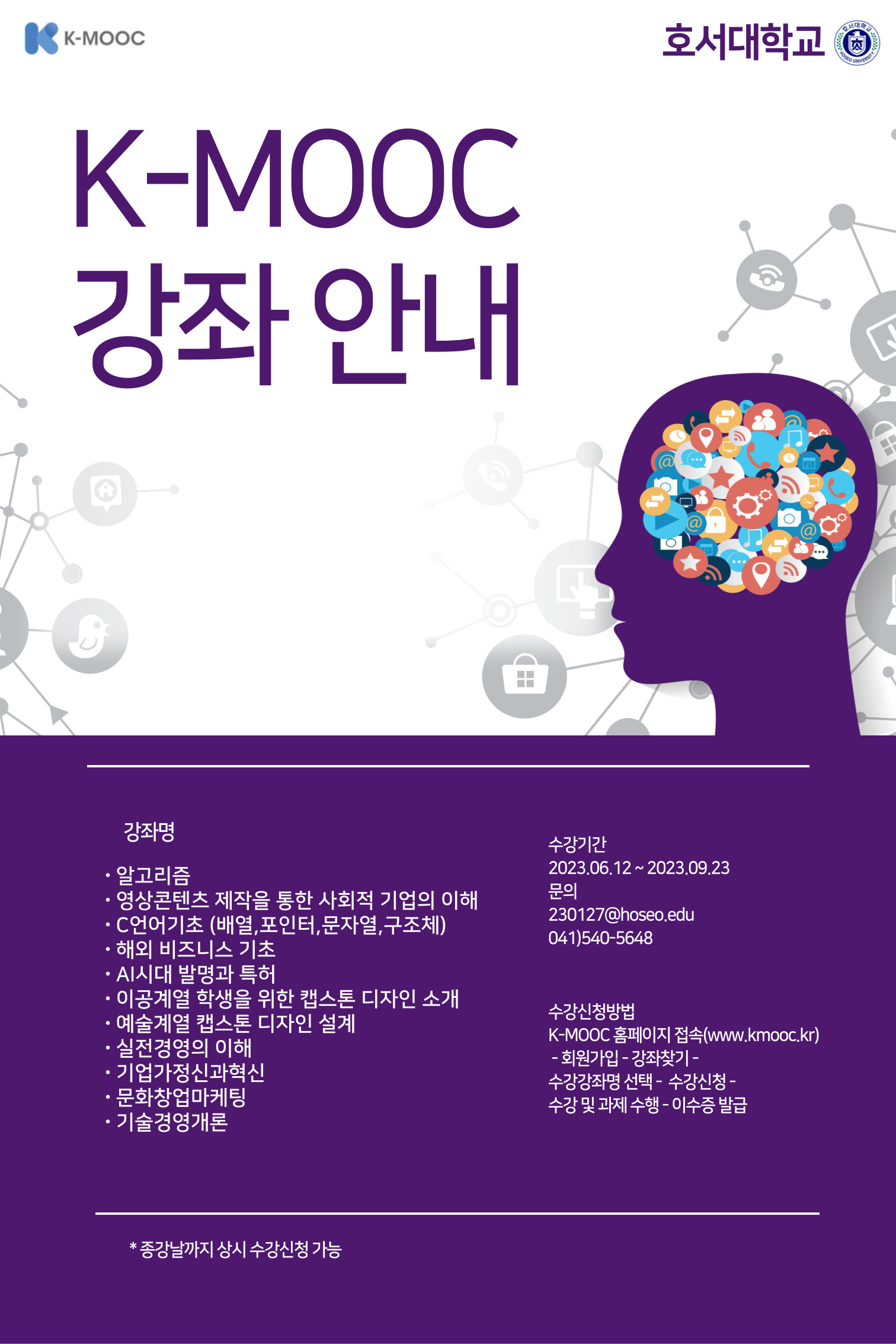 호서대학교에서 한국형 온라인 공개강좌(K-MOOC)를 아래와 같이 운영합니다.