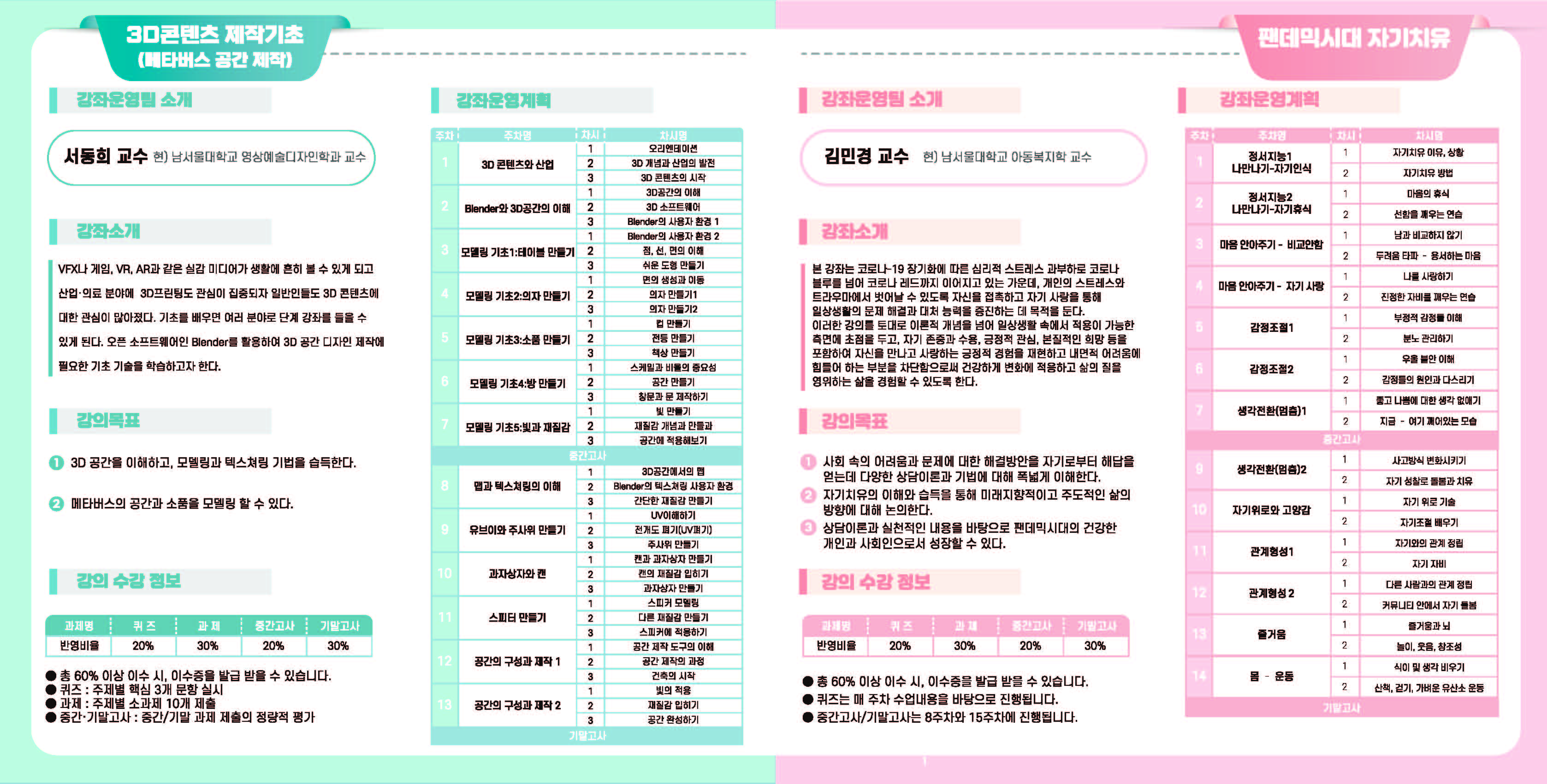 남서울대학교 K-MOOC 강좌 수강안내(3D콘텐츠 제작기초(메타버스 공간 제작) 외 1과목)
